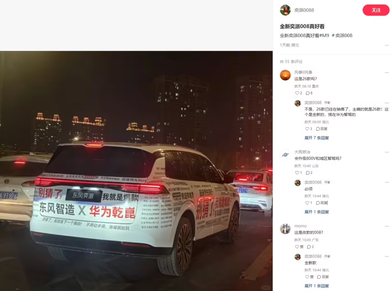 相关信息显示,新车由东风智造 × 华为乾崑联合打造,定位大六座 SUV,号称「华为 Wei(为)十足」、「遥遥领先同行」。有用户询问新车是否会升级 800V 和城区智驾?该博主表示:「必须。」(来源:IT 之家)