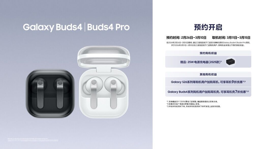 三星 Galaxy Buds4 建议零售价 1,399 元,三星 Galaxy Buds4 Pro 建议零售价 1,899 元。2 月 26 日 03 点,三星 Galaxy Buds4 系列耳机将在三星商城、三星京东自营官方旗舰店、天猫三星官方旗舰店、抖音三星官方旗舰店等线上渠道以及线下授权三星门店正式开启预约。成功预约三星 Galaxy Buds4 系列耳机消费者,即有机会获赠 25W 电源充电器 (2025 款),Galaxy S26 系列购机用户加购耳机可享耳机 9 折优惠。(购买 Galaxy S26 系列手机同时加购耳机可享 9 折,折扣以耳机厂商建议零售价为基准。)