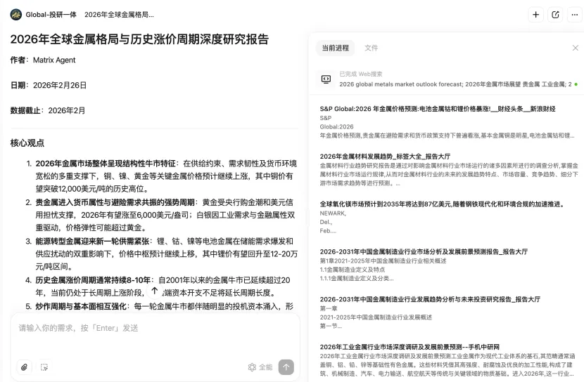 我们用 Global 投研一体 Expert,一句话提出需求:分析 2026 年贵金属行情是否持续、周期多久、历史周期的启发,AI 在短时间内输出了一份结构化的《2026 年全球金属格局与历史涨价周期深度研究报告》,内容之专业、分析之深入,堪比券商研报。