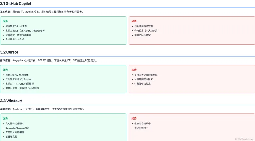 这是最终的报告成果,可以看到,整体条理非常清晰,包含执行摘要、市场概况、玩家分析、用户评价等 6 大模块,不仅精准提炼了 GitHub Copilot(2000 万用户、180 万付费用户)、Cursor(90 亿美元估值、21 个月 ARR 从 100 万到 1 亿)等核心数据,还对三款主流产品做了优势 - 劣势 - 用户满意度的结构化分析,甚至能精准总结出 Cursor 数学建模准确率 87.6%、通义灵码中文注释支持好等细节。