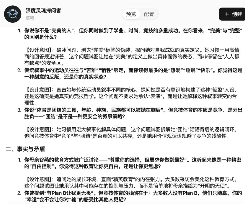 基于这一配置生成深度灵魂拷问者 agent,我让它做了一份关于最近再次爆火的谷爱凌的采访提纲,其尖锐程度和深度,完全超出了预期。