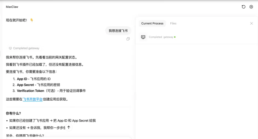 在飞书开放平台创建应用获取 App ID 和 App Secret,回到 MiniMax MaxClaw 对话式完成网关配置,全程不到 5 分钟,没有任何技术操作。