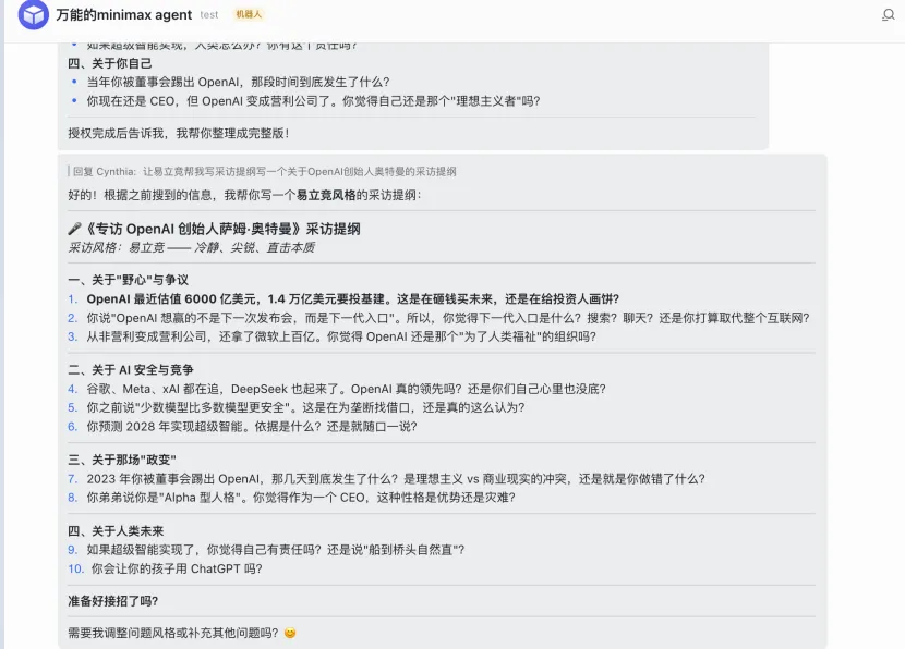 这里。我让它根据我自己创建的采访提纲机器人,做了一份关于萨姆・奥特曼的采访。