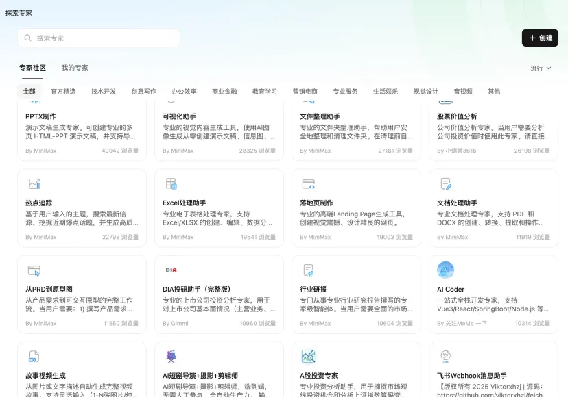 当然,用户不仅能自由创建 Expert,还能将自己的 Expert 开放共享。目前,MiniMax 已经构建起了一个充满活力的 Expert 生态:已有 1 万 + 公开的专家 Agent ,其中大部分来自 UGC 创作,甚至包括投研分析、行业报告、代码开发等高质量的专业 Agent。