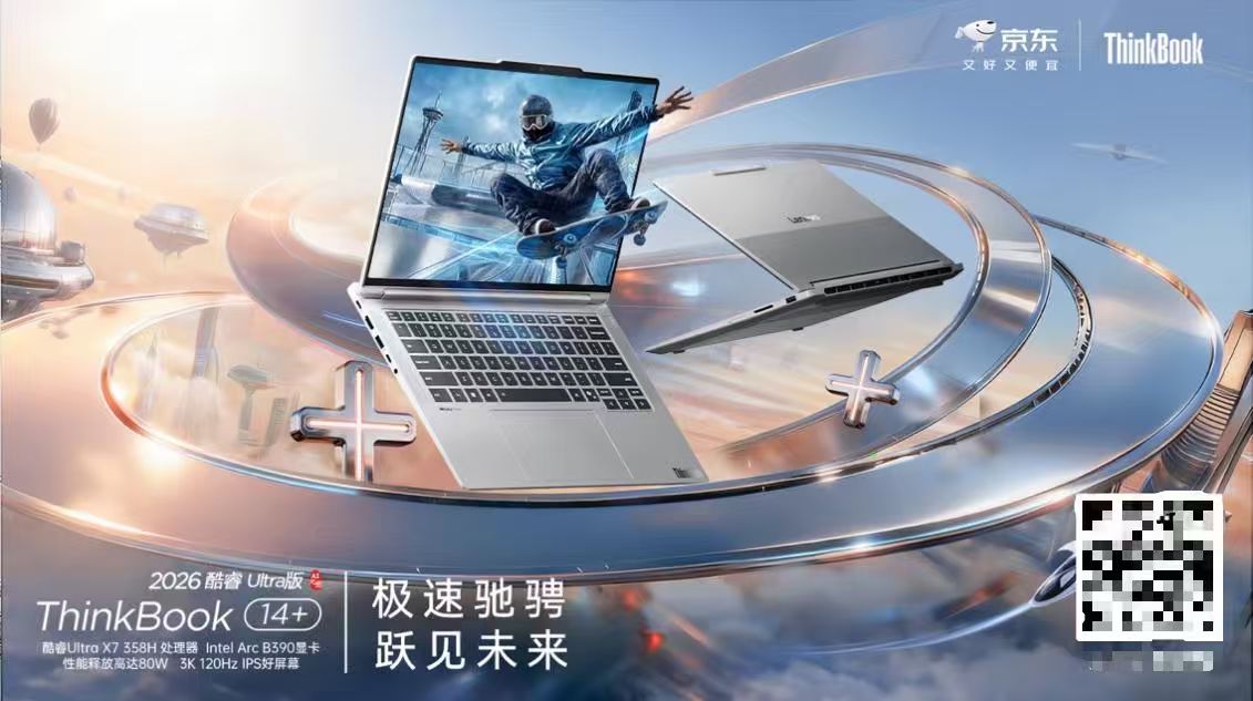 3 月 3 日晚 8 点,ThinkBook 14+ 2026 款将于京东正式开售,同系列更大尺寸的 ThinkBook 16+ 2026 AI 全能本也同步登场,同样搭载英特尔酷睿 Ultra X7 358H 处理器,为用户提供更多元的选择。京东首发期间下单,随箱即赠无线鼠标,晒单登记再送电脑包。现在逛京东焕新,更可享受首发直降专属权益,开启跃见未来的 AI 全能体验。