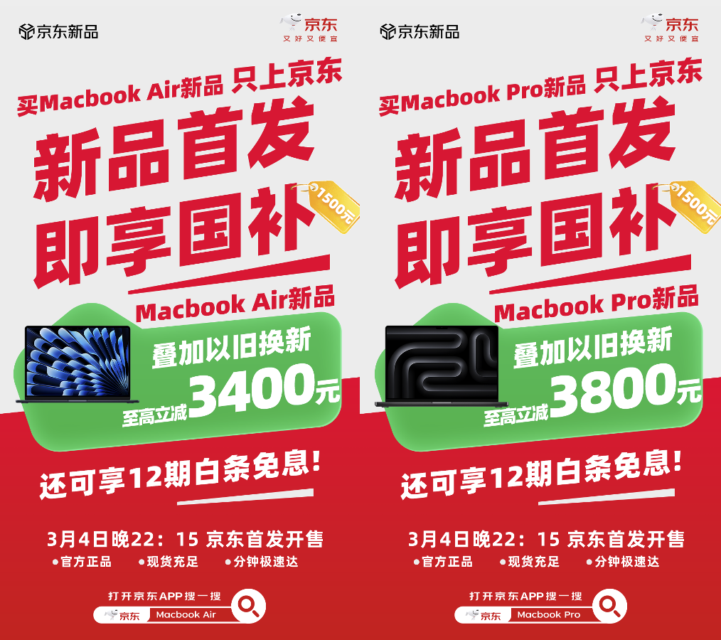 3 月 4 日 22 点,2026 新款 MacBook Air 与 MacBook Pro 正式发布,3 月 4 日 22:15 开启预购,3 月 11 日正式发售。目前,两款新品已在京东上线专属预约通道,用户打开京东 App 搜索「苹果新品福利」即可直达活动页面。购买新款 Macbook Air 享国补 15% 至高 1500 元、教育优惠 800 元起、以旧换新补贴至高 1100 元,购买新款 Macbook Pro 享国补 15% 立减 1500 元,教育优惠 1200 元起,以旧换新补贴至高 1100 元,均可支持 12 期免息,为用户带来更实惠的焕新体验。