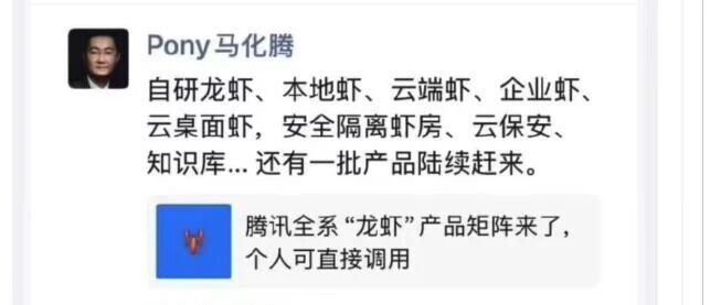 腾讯董事会主席兼首席执行官马化腾今天凌晨 2 时许在朋友圈转发了腾讯推出全系「龙虾」产品矩阵的公众号文章,并配文「自研龙虾、本地虾、云端虾、企业虾、云桌面虾,安全隔离虾房、云保安、知识库…… 还有一批产品陆续赶来」。