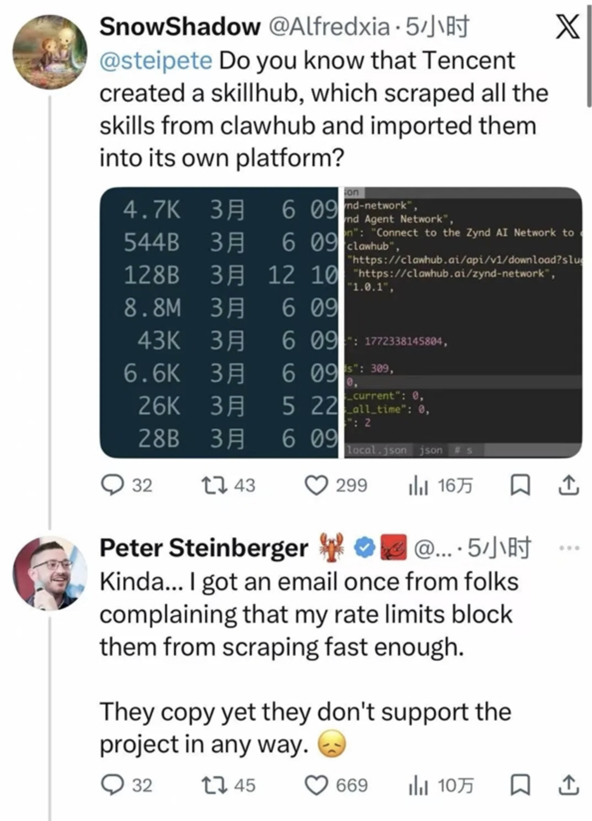在社交平台上,有用户提问 OpenClaw 创始人 Peter Steinberger:是否知道腾讯正在抓取 Clawhub 上的技能并导入到该平台中。