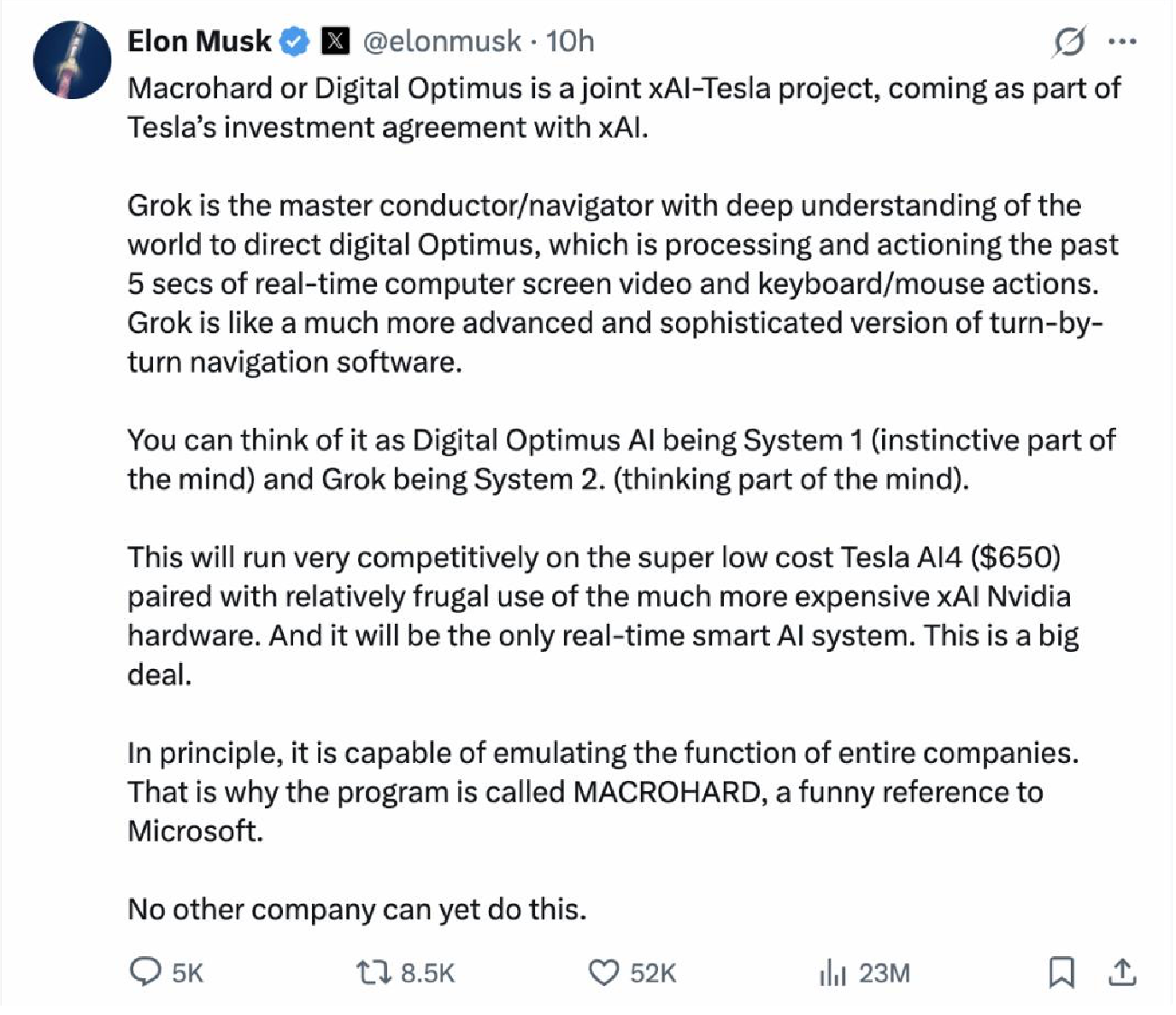 3 月 12 日,马斯克在 X 平台上正式宣布了一项全新的重磅 AI 项目:「数字擎天柱(Digital Optimus)」,项目代号直指微软,定名为「巨硬(Macrohard)」。不同于在现实世界搬砖的实体机器人,数字擎天柱是一位主攻网络和电脑端操作的「数字 AI 员工」。