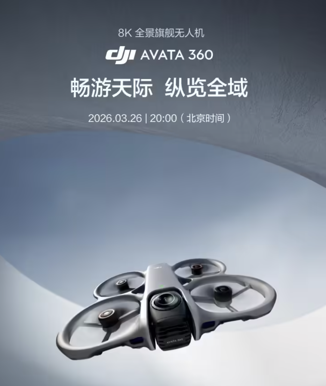 3 月 12 日,大疆正式官宣了首款 8K 旗舰全景无人机 DJI Avata 360,新品主打 8K 旗舰全景影像与飞行体验,将于 3 月 26 日 20:00 全球发布。