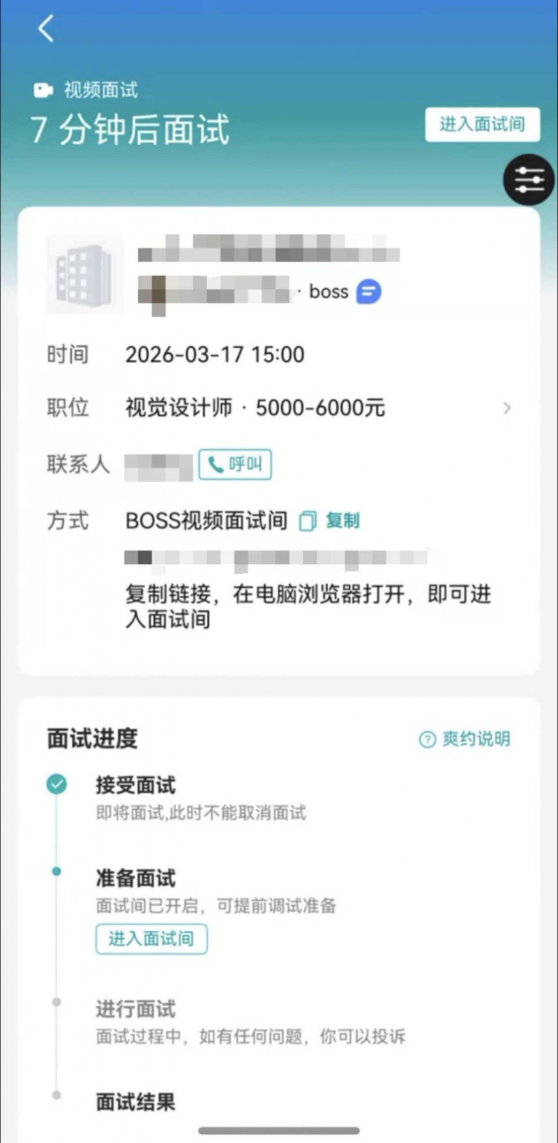 以前 HR 约面试,得先加微信、再发会议链接、再提醒上线……现在鸿蒙版 BOSS 直聘直接内置视频面试,聊天界面一键发起、一键接听,省掉中间所有折腾。
