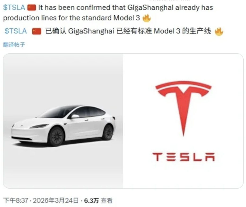 3 月 25 日,自特斯拉 Model 3 标准版于去年 10 月发布以来,据爆料者 @tslaming 透露,特斯拉正准备在中国市场推出 Model 3 标准版车型,上海超级工厂已建成相关生产线。