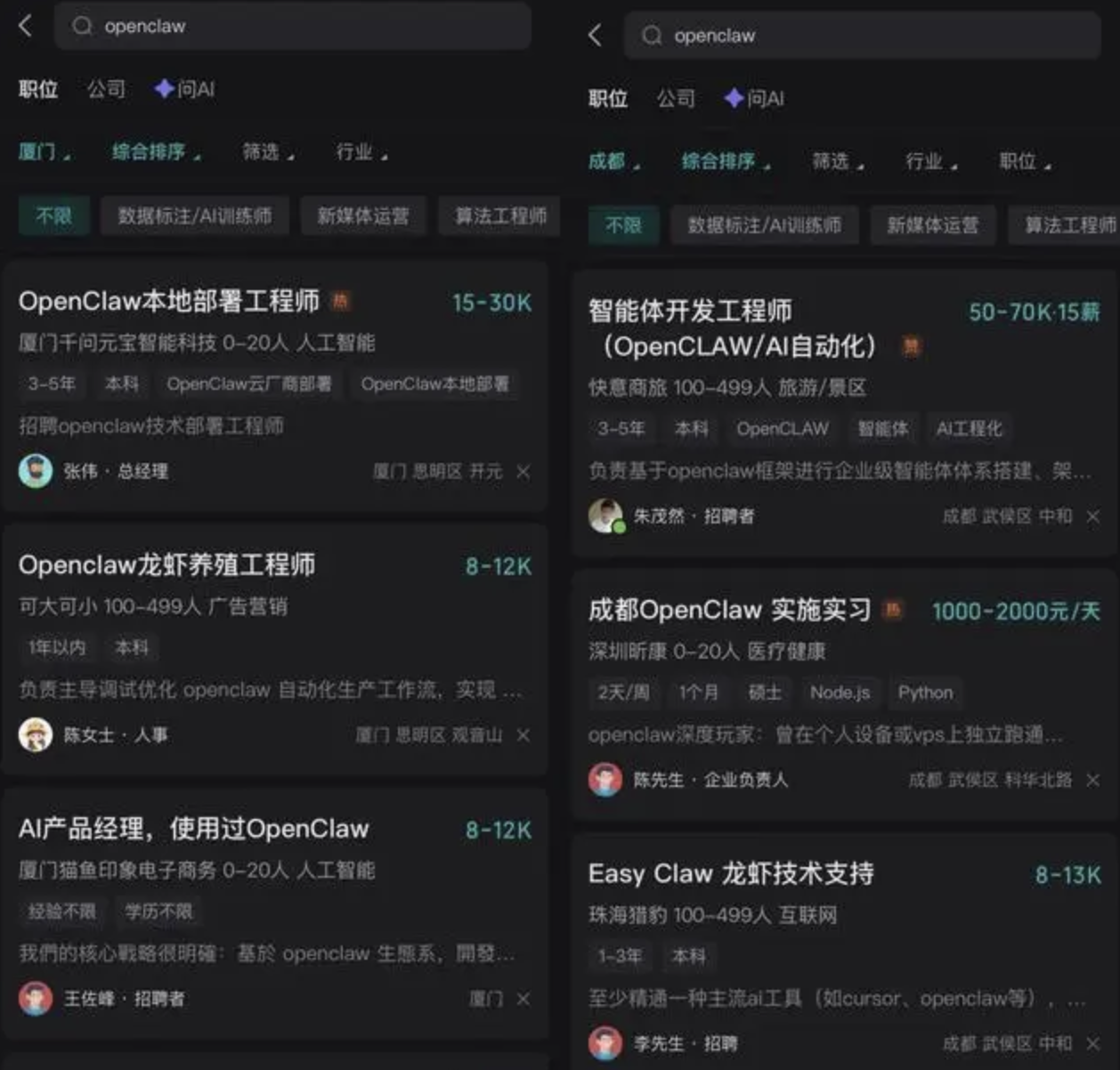 与此同时,「OpenClaw 开发工程师」 等岗位聚焦 Agent 私有化部署,强调开源社区贡献;「养虾达人」类运营岗则侧重 AI 工作流落地。