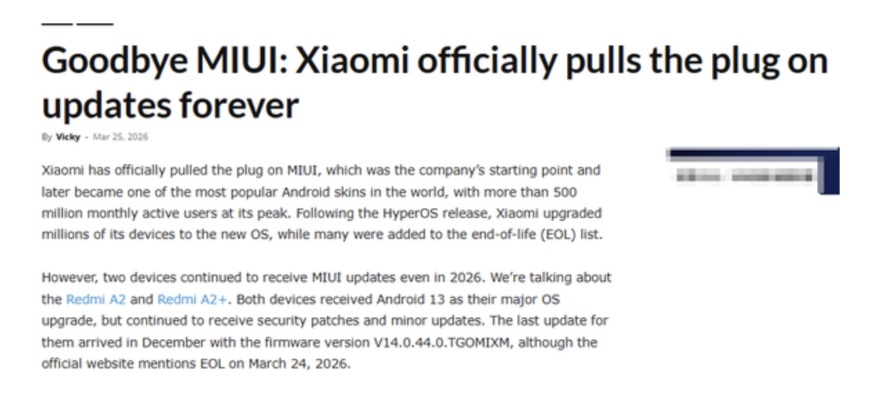 3 月 25 日,据报道,小米已终止了所有 MIUI 设备的系统更新,运行 15 年的经典安卓定制系统彻底推出了历史舞台。