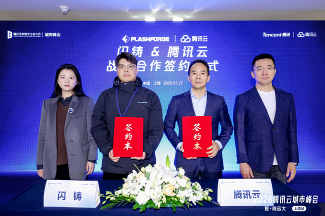3 月 27 日,腾讯云上海城市峰会期间,腾讯云与 3D 打印公司闪铸签署战略合作协议。