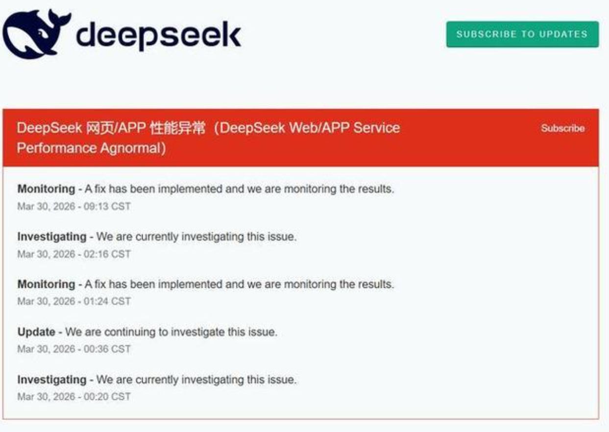 DeepSeek 服务已恢复正常,此前崩溃约 12 小时
