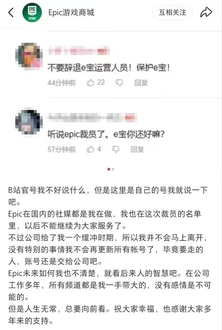 同时,还有网传截图显示,其中自称是「Epic 游戏商城」官方公众号的运营者声称「自己的确在裁员名单上,但公司给予了一定缓冲时间,后续将会有新员工接替自己的工作」。
