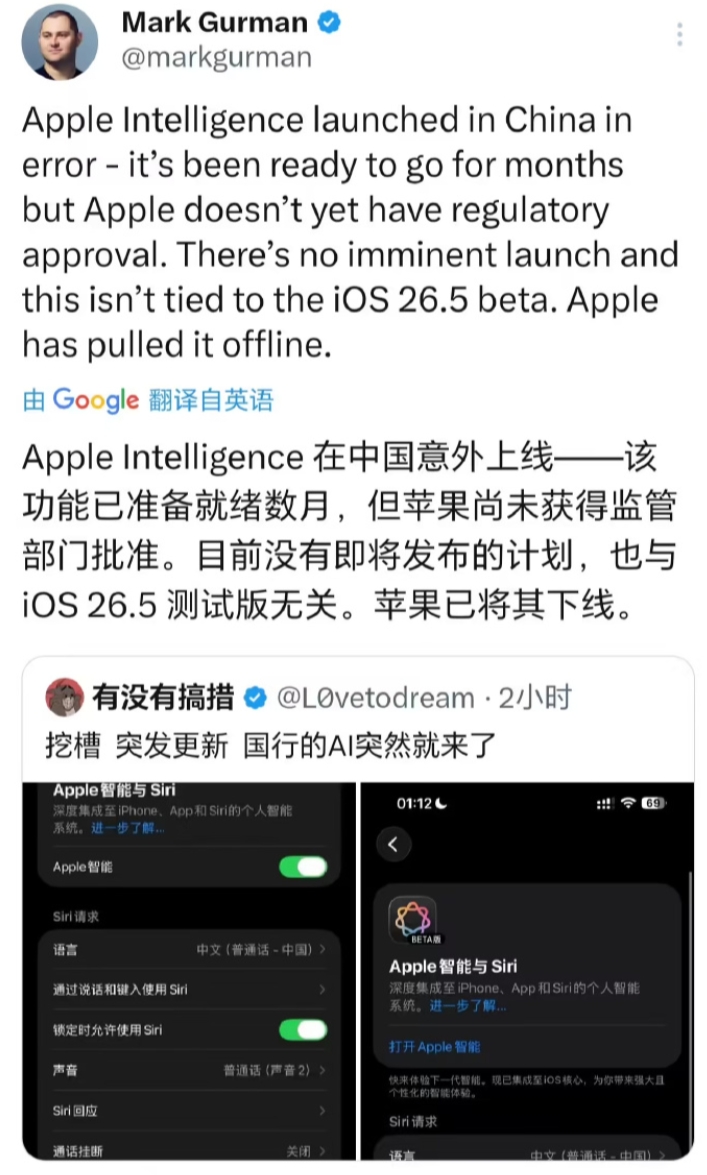 古尔曼:Apple Intelligence 在中国意外上线,苹果已将其下线