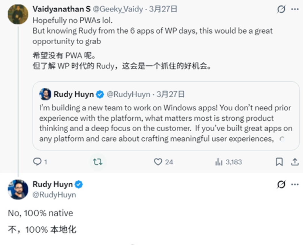 有开发者询问新应用是否采用 PWA 架构,Huyn 直接否定了这一猜测,明确回应「100% 原生」。