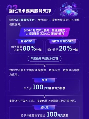 《若干措施》明确,对 OPC 购买算力服务、数据集服务、大模型服务以及 AI 工具链的费用,给予最高不超过 80% 的补贴;高校学生创办的 OPC,可额外享受 20% 补贴,年度补贴最高可达 30 万元。所有 OPC 均可直接申领半个月 100 卡时的免费算力额度,零成本开启 AI 研发工作。更值得关注的是,政策专门设置了技术创新专项奖励,OPC 开发的 AI 工具、技能包等上架国际主流开源社区,经认定可获得年度最高不超过 100 万元的奖励,真金白银鼓励技术创新与全球化落地,让 OPC 创业团队的创新价值得到充分认可。