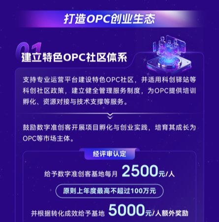 政策支持专业运营平台建设特色 OPC 社区,并适用科创驿站等科创社区政策,配套培训孵化、资源对接与技术支撑服务;对数字准创客孵化基地,给予每月 2500 元/人的运营补贴,原则上年度最高不超过 100 万元,还可根据项目转化成效享受 5000 元/人的额外奖励;对建设 AI 工具服务、数据服务等功能性平台的机构,按年度服务成效给予最高不超过 100 万元奖励。