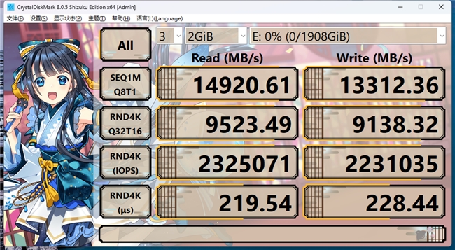 先上 CrystalDiskMark,这是目前最常用的测速软件,能反映硬盘的真实峰值性能。跑下来顺序读取 14920MB/s,写入 13312MB/s,跟官方标的 14900/13400 MB/s 基本没差。随机读写分别是 2325K IOPS 和 2231K IOPS,比官方标的还高了不少。