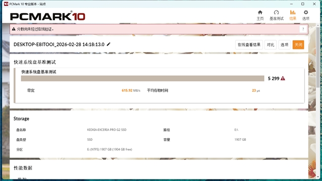 在快速系统盘基准测试中,铠侠 VE10 得分 5299 分,平均带宽 615MB/s,平均存取时间 23μs。