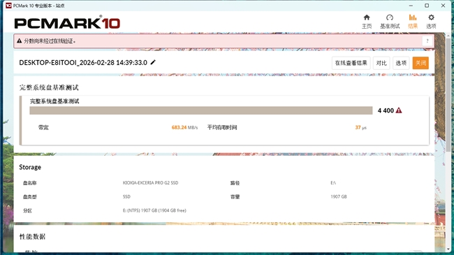 在完整系统盘基准测试中,铠侠 VE10 得分 4400 分,平均带宽 683MB/s,平均存取时间 37μs。不管是运行 Office 全家桶、Adobe 全家桶、剪映这样的生产力软件,还是进行网页浏览、视频播放这些休闲娱乐活动,铠侠 VE10 都能有着更好的体验。