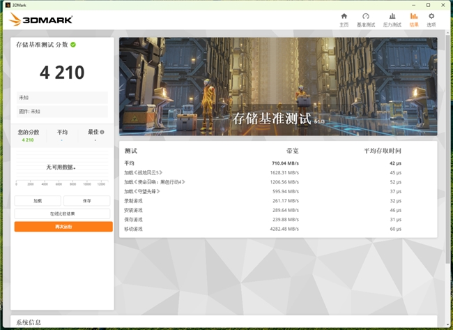 最后跑了 3DMark 的存储基准测试。这个测试我比较看重,因为它模拟的不是跑分,而是实际玩游戏会遇到的情况。VE10 最后得分 4210 分,这个成绩让我很满意。毕竟 3DMark 的测试成绩跟整机配置关系很大,而因为近期内存涨价,我只好买了一对 6000 C38 的内存作为过渡,如果换成更强的 CPU 和内存,分数还能再涨一截,突破 5000 还是很轻松的。