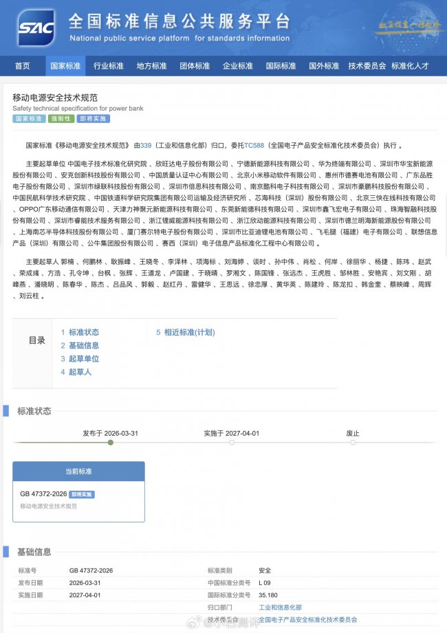 4 月 3 日,被称为「史上最严」的移动电源强制性国家标准(GB 47372—2026)正式落地。