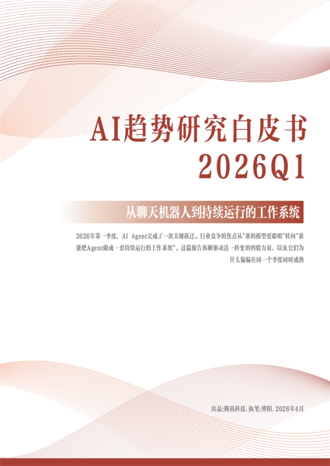 4 月 10 日,腾讯新闻重磅发布《AI 趋势研究白皮书 2026Q1》(以下简称白皮书),聚焦 2026 年第一季度 AI Agent 领域的关键变化、技术突破与产业影响进行深度解读。