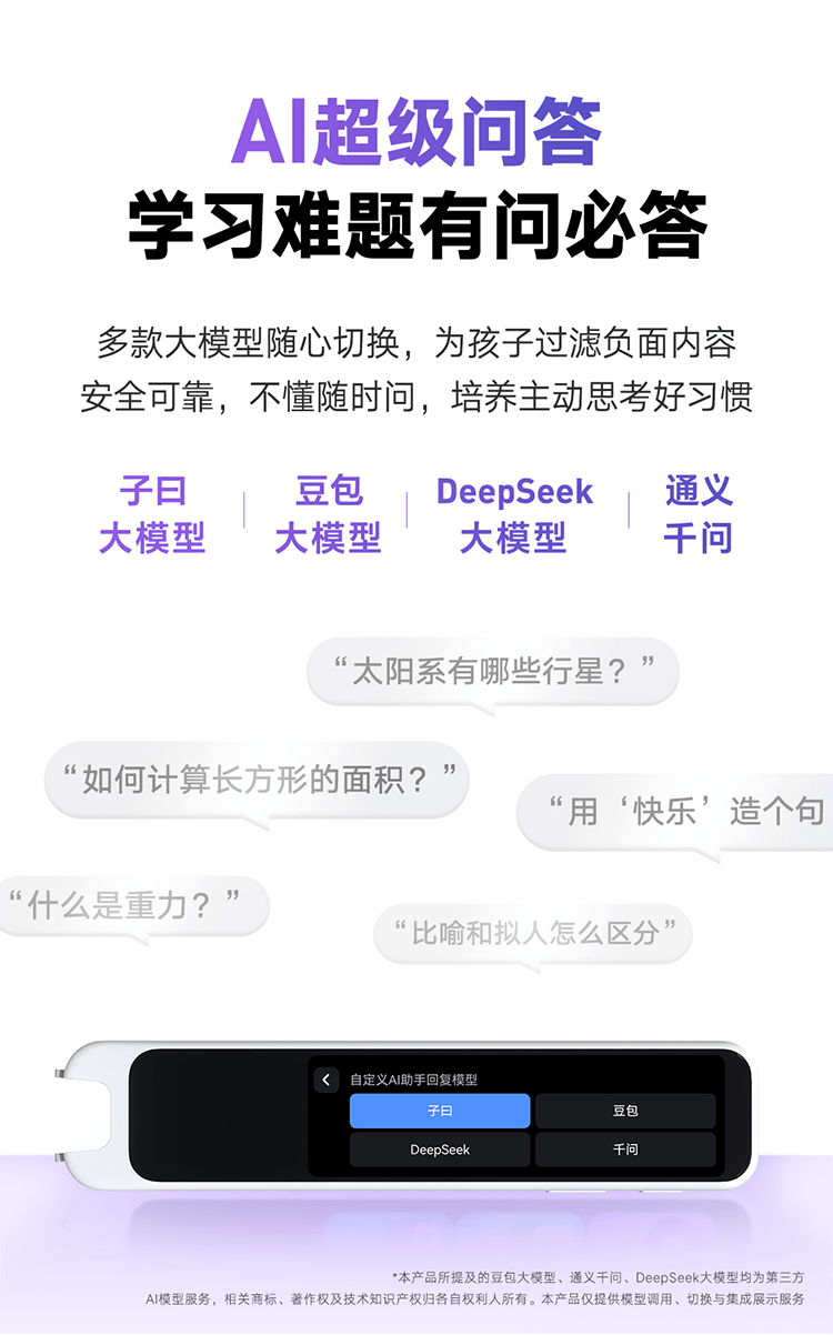 与行业普遍直接调用单一公开大模型 API 不同,有道词典笔 A7S 集成了豆包、千问、DeepSeek、子曰等主流模型集群,用户可根据推理或语言场景自由切换。但这一架构的核心不在于算力堆叠,而在于有道对教育场景的垂直调优与安全管控。