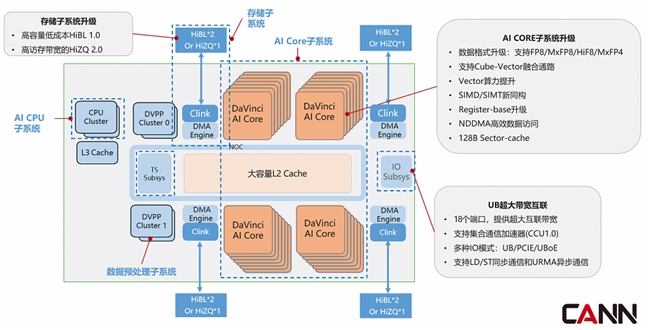 ● 张量-向量协同计算:单核内 Cube 核(张量计算)峰值算力与上一代持平,Vector 核(向量计算)FP16/FP32 性能翻倍,二者通过高速直连通道实现数据无缝流转,彻底解决传统 AI 芯片在混合计算(如 FA)任务中的瓶颈问题。