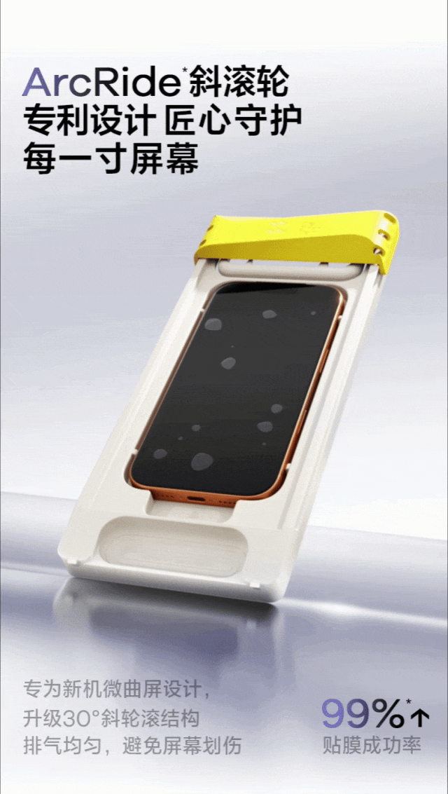 就连贴膜这个动作,闪魔也做了重新设计,只需将手机放置模具中,拉一下 30 度的斜角滚轮,就能实现完美贴膜,成功率高达 99%。 手残党也能一次贴好 。