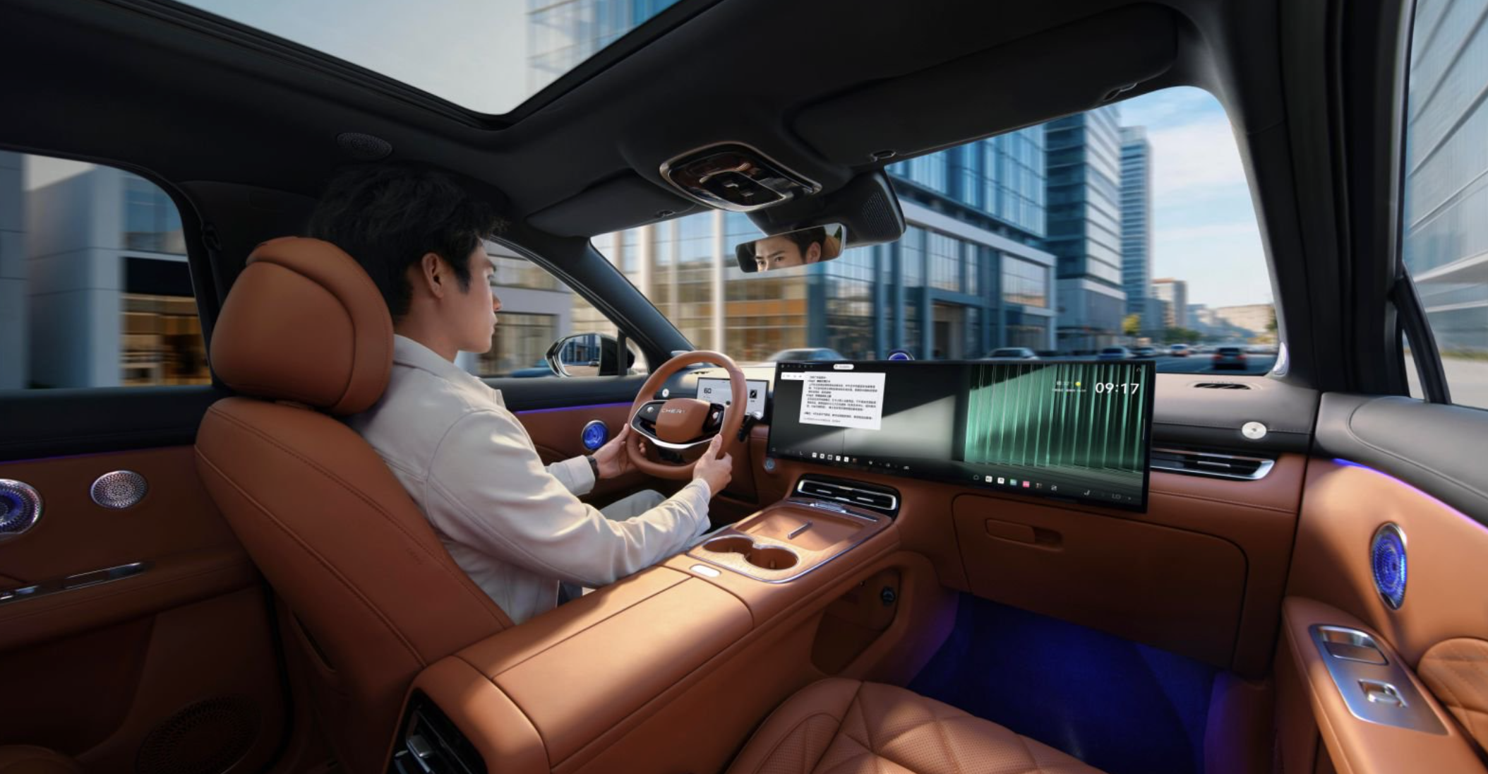 30吋6K一体寰宇屏——奇瑞称这是全球燃油车品类里最大的车载屏幕,6K分辨率,90%屏占比,1000nit HDR亮度,反光率只有2%。主副驾可以分屏独立使用。从体验感受来说,相当于在中控位置放了一块IMAX级别的私人屏幕。