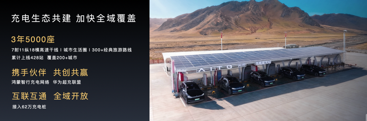 问界持续升级智享服务,首创数智维修车间、AI 主动服务、亲友同享礼遇、星夜服务免费取送,移动服务已在全国主要城市实现覆盖,为用户提供全周期便捷用车守护。与鸿蒙智行共创共建充电网络,计划三年内建设超过 5000 座充换电站,目前累计上线 428 座,覆盖超过两百多个城市,让用户出行无忧、充电更便捷。