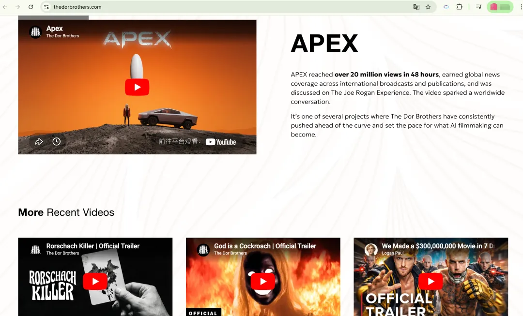 而在此之前,作为全球范围内最有影响力的 AI 视觉创作者之一,Dor Brothers 的作品在社媒上,动辄就是数百万甚至千万的播放量,去年全网累计播放更是超过 5 亿次,常常视频中一句话就能影响一个模型的估值。但他们同时也是最早在国际舞台上推广海螺 AI 的布道者。在多个公开场合,Dor Brothers 都曾毫不吝啬地表达对海螺的认可。甚至,团队还直接将其用 Hailuo 02 制作的视频《APEX》放在了公司官网首页,单独展示。