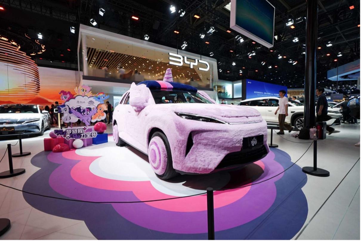 在产品力全面进化的同时,第三代元 PLUS 在品牌营销与文化跨界上也迈出了极具想象力的一步。在本次北京车展上,新车宣布与全球知名 IP《小马宝莉》展开深度合作。这一举措看似出人意料,实则逻辑严密。《小马宝莉》所传递的友谊、勇气、陪伴与冒险的情感内核,与元 PLUS 所倡导的元气、活力、积极向上的年轻生活态度高度契合。展台上那台以经典角色「紫悦」为灵感打造的「元气痛车」,瞬间成为了全场最具人气的打卡地标。这种将二次元文化与汽车工业产品深度融合的尝试,不仅拉近了品牌与年轻一代消费者的心理距离,更为冰冷的机械赋予了温暖的情感温度。