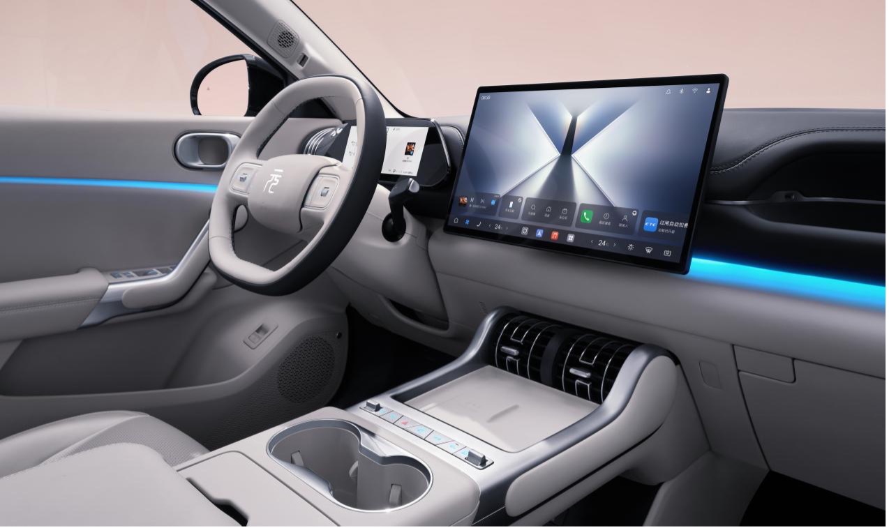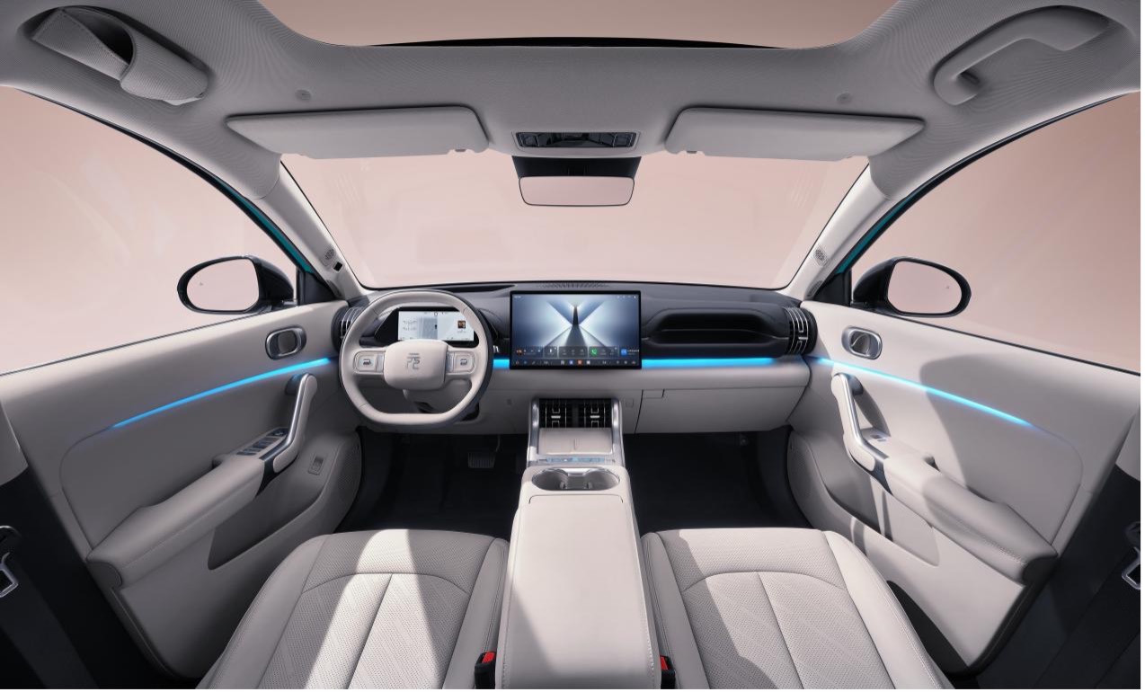 如果说外观是给路人看的,那么座舱则是用户每天都要沉浸其中的「第三空间」。当今的消费者对于车内环境的期待,早已超越了简单的代步工具属性,他们渴望舒适的触感、愉悦的视觉以及能够提供情绪价值的互动体验。第三代元 PLUS 的内饰设计师提出了一种名为「流体生态舱」的全新理念。整个座舱内部几乎找不到生硬的直角,取而代之的是圆润的线条和流畅的曲面,仿佛自然界中被流水冲刷过的岩石,给人一种天然的亲近感。层叠悬浮式的立体曲面中控台,通过材质与光影的交错,营造出极其柔和且富有层次感的车内氛围。