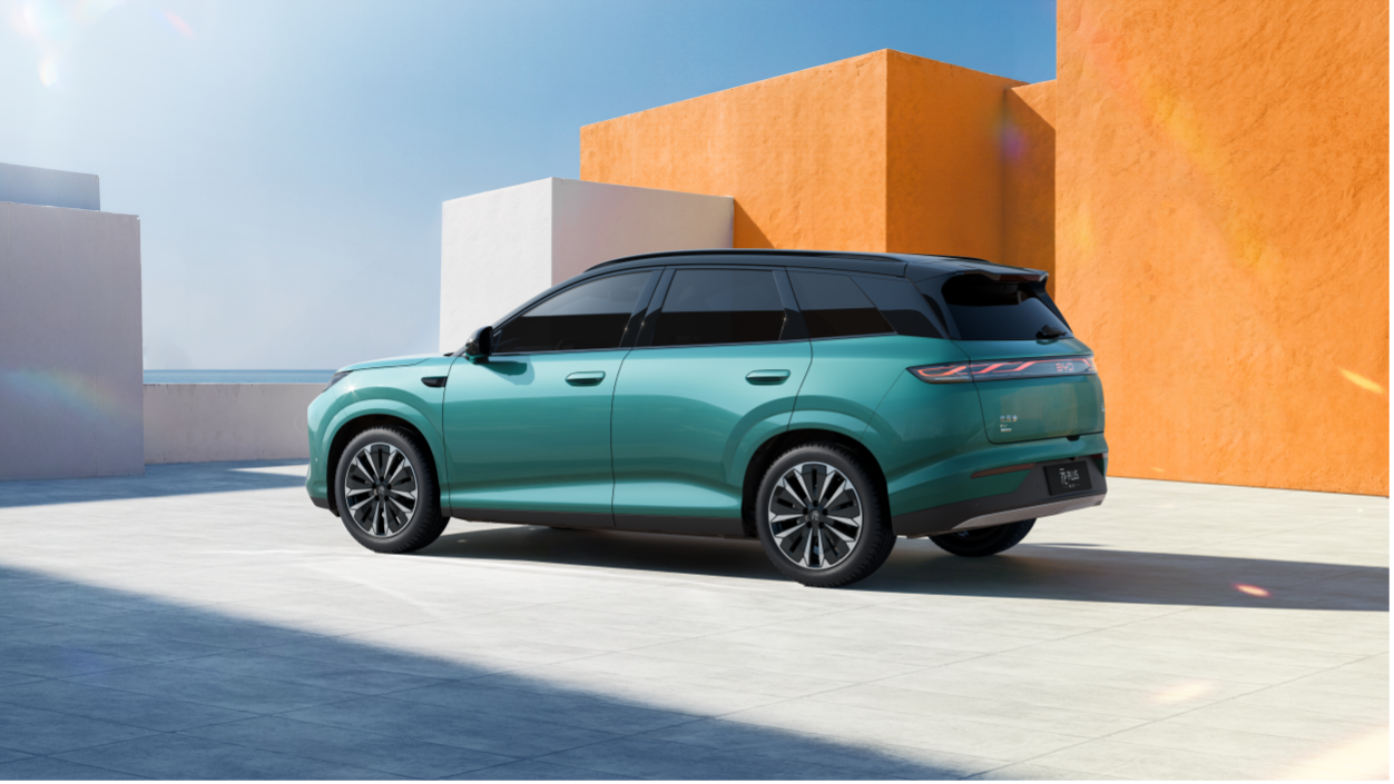 然而,尺寸的增加并没有让这款车显得臃肿。汽车设计界有一句名言,好的线条能够欺骗视觉。第三代元 PLUS 的设计师巧妙地运用了流体力学的视觉原理,通过极其流畅的腰线贯穿车身,配合与车身同色的轮眉以及贯穿式的侧裙,将增加的体量感完美地「隐藏」在了动感的姿态之中。刀锋造型的 D 柱与悬浮式车顶的经典搭配被保留并加以优化,使得整车的侧面轮廓呈现出一种轻盈的跃动感。当视线转移至车尾,环抱式的形面设计与全新升级的能量回路尾灯相得益彰,在夜间点亮时,不仅具有极高的品牌辨识度,更散发出浓郁的现代科技气息。为了满足不同消费者的审美偏好,新车还提供了 18 寸光环轮毂与 19 寸箭羽轮毂两种截然不同的风格选项,进一步强化了车辆的个性化标签。