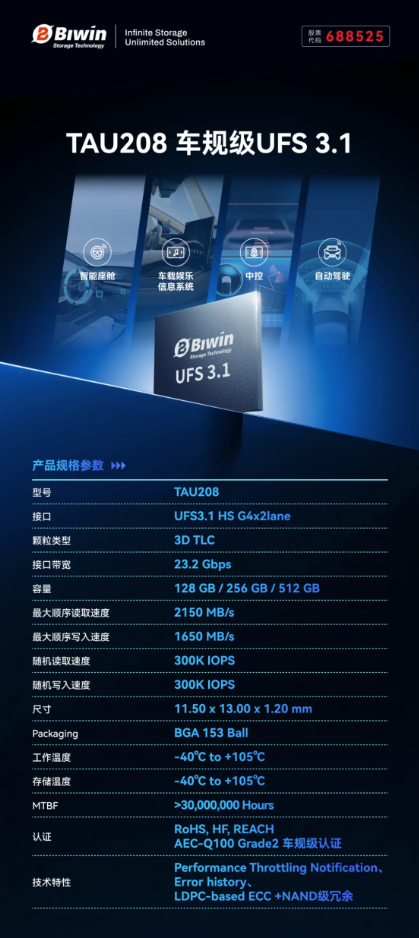 佰维存储 TAU208 车规级 UFS 3.1 存储产品集成了公司在芯片设计、固件算法及封测制造领域的全产业链技术优势,以 23.2Gbps 的高带宽和车规级 AEC-Q100 Grade 2 的严苛可靠性,为智能汽车打造了一颗「极速且强韧」的数据心脏,可广泛应用于智能座舱、自动驾驶、车载信息娱乐系统及数字仪表盘/中控等核心场景。