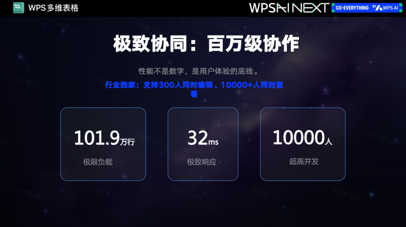 技术性能同样构成竞争壁垒。在百万行数据规模、千级并发连接条件下,WPS 多维表格实现 32 毫秒平均编辑响应延迟,支持万人同时协作。极致的性能不是为了参数竞赛,而是为了载大规模 AI 组织协作时的实时吞吐。没有毫秒级的响应,AI 协同就无法深入到生产一线。