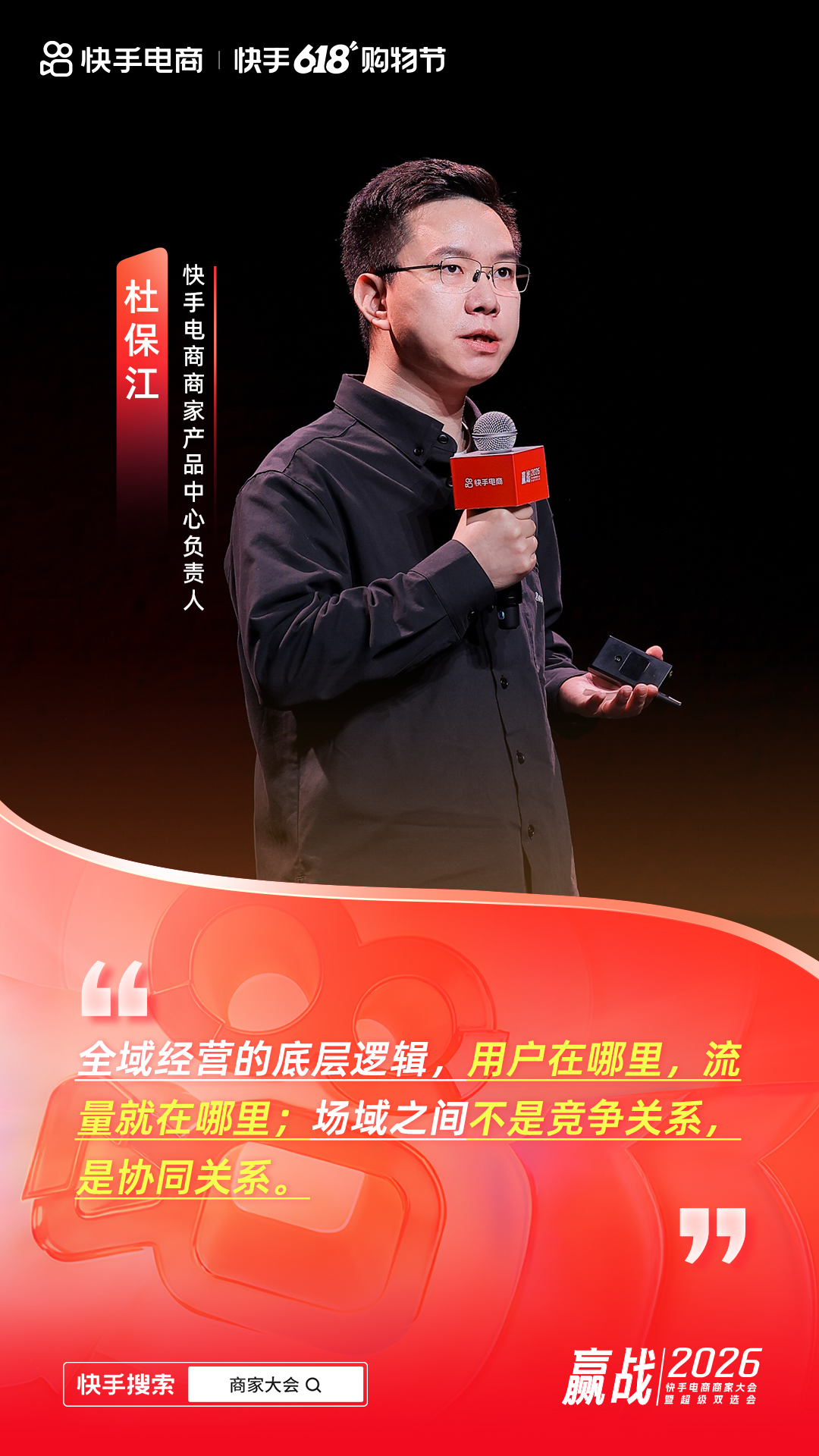 4 月 23 日,"赢战 2026"快手电商超级双选会在杭州举办。会上,快手电商商家产品中心负责人杜保江围绕《全域协同 长效经营》主题,全面分享快手电商商家生态发展成绩及全域经营策略,并发布 AI 工具全周期解决方案,携手商家聚焦全域增长、实现长效经营。