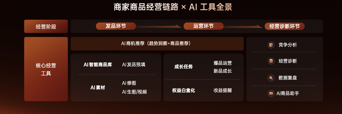 在经营诊断环节,AI 经营诊断和商品助手 24 小时在线,帮商家看透数据(哪个品在涨、哪个品在掉)、找准问题(转化率低是详情页还是价格问题)、抓住机会(平台活动与商品匹配度)。AI 商品助手 Agent 整合全链路 AI 能力,支持自然语言对话,成为商家的一站式经营助手。