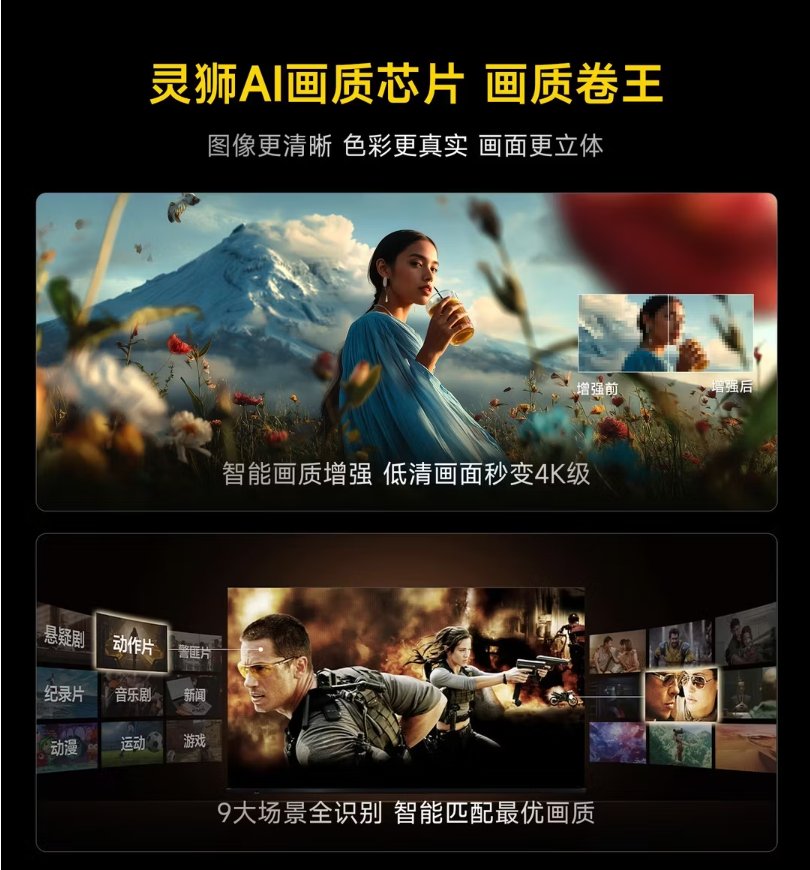 如果说硬件是画质的基础,那么算法就是画质的灵魂。Vidda 发现 X 2027 搭载了同档最强的灵狮 AI 画质芯片,依托海信多年积累的画质调校经验,能够对画面进行全方位的智能优化。它可以实时识别电影、追剧、动漫、纪录片等 19 种不同场景,自动调节色彩、对比度和清晰度;还能通过 AI 超解像技术,将 2K 甚至更低分辨率的内容提升至接近 4K 的效果,让老片也能焕发新生。