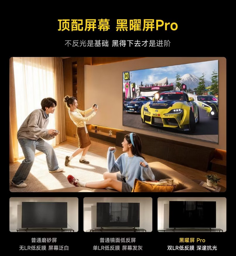 好的背光系统需要一块好屏幕来承载,Vidda 发现 X 2027 搭载了顶配的黑曜屏 Pro。这块屏幕采用了双 LR 纳米级抗光膜技术,整机反射率低至 1.8%,面板反射率更是达到了 0.5% 的行业顶级水平。同时,黑曜屏 Pro 还拥有 4K 180Hz 的原生刷新率,比普通 60Hz 电视流畅度提升了 3 倍,无论是观看体育赛事还是玩高速动作游戏,都不会出现拖影模糊的问题。
