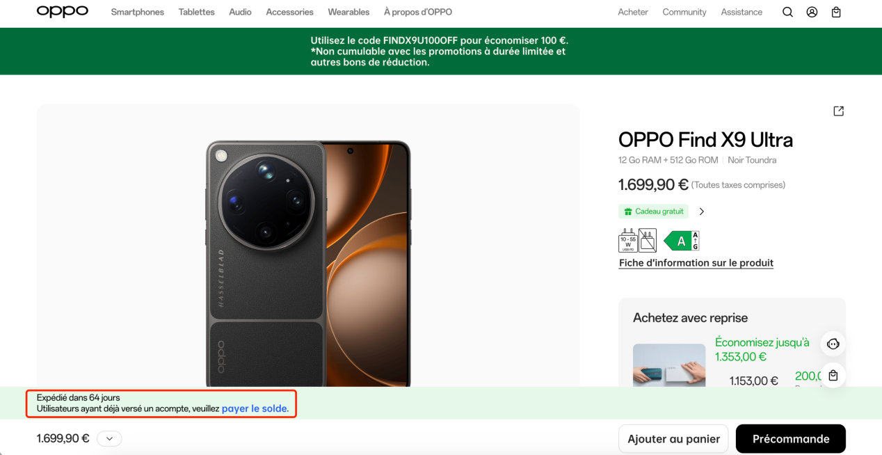 在法国市场,OPPO 官网数据显示,Find X9 Ultra 512GB 版本目前已全面售罄,现在下单需等待 64 天方可发货,折合人民币约 13600 元的售价并未阻挡法国消费者的热情。